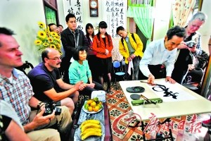 下午2時(shí)整,羅澤權(quán)下樓迎接德國(guó)游客。一名德國(guó)游客連連稱贊說,“能夠把古建筑保留下來,對(duì)于這個(gè)地區(qū)非常有意義,都府社區(qū)古色古香,反映了廣州的歷史文化,非常棒!”過了一會(huì)兒,羅澤權(quán)老人拿出筆墨紙硯,揮毫寫下了一個(gè)大大的“福”字,并將這幅書法送給了其中一名德國(guó)游客。臨別時(shí),23名德國(guó)游客依依不舍地與羅澤權(quán)老人一一握手道別,并祝他老人家“健康長(zhǎng)壽,越活越年輕”!