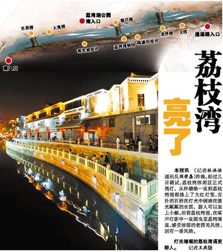 廣州日報11月3日報道 昨晚,經(jīng)過幾日調試,荔枝灣休閑區(qū)正式亮燈,從泮塘路一直到荔枝灣涌都掛上了大紅燈籠,古樸的石橋在燈光中倒映在波光粼粼的水面,游人可以坐上小艇,沿著荔枝灣涌,在槳聲燈影中一直搖曳至荔灣湖里,感受濃郁的老西關風情,別有一番風韻。
