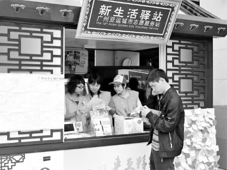 昨天下午當(dāng)班的黃洪丹,是廣東交通職業(yè)學(xué)院的大二學(xué)生,也是同行8人的班長。她為記者一一介紹了站內(nèi)各種方便設(shè)施,告訴記者今天短短幾個小時,她們已經(jīng)接待了100多位前來咨詢的朋友,“就是剛才,我們剛給一大幫外國朋友指了去亞運村的路呢!