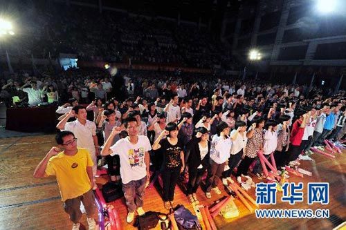 10月23日晚,華南師范大學(xué)舉行2010廣州亞(殘)運(yùn)會(huì)志愿者出征誓師儀式暨2010年迎新生文藝晚會(huì),該校1860名亞(殘)運(yùn)會(huì)志愿者代表參加晚會(huì)。身為廣州亞運(yùn)會(huì)志愿者形象大使的羽毛球名將謝杏芳來(lái)到活動(dòng)現(xiàn)場(chǎng),帶領(lǐng)大家共同宣誓。