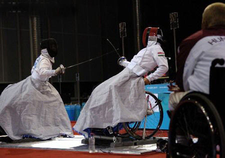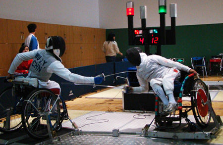 輪椅擊劍運(yùn)動是根據(jù)下肢殘疾運(yùn)動員(包括截肢, 脊髓灰質(zhì)炎, 腦癱和截癱)的特點(diǎn)而專門設(shè)計的一項運(yùn)動。對于觀眾來說,輪椅擊劍運(yùn)動最讓他們感到與眾不同的,就是比賽雙方運(yùn)動員的輪椅都固定在可調(diào)節(jié)軌道的框架上進(jìn)行比賽。然而,盡管坐在這樣的輪椅上,運(yùn)動員只能自由移動他們身體的上半部分,但他們出劍的速度并不比健全運(yùn)動員慢,甚至要更快。
