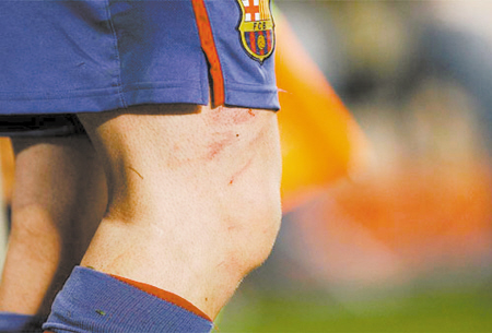 梅西大腿上被鞋釘刮傷的血痕。 圖片來源:成都商報(bào)