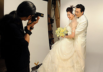這對(duì)新人在去年九月份領(lǐng)取了結(jié)婚證。在拍攝婚紗照的時(shí)候他們始終保持著微笑,不過偶爾李佳薇也會(huì)感到有些別扭。“有時(shí)候我都快不能呼吸了,”李佳薇穿著婚紗說。她為北京和新加坡的婚禮宴會(huì)總共定做了13套婚紗。