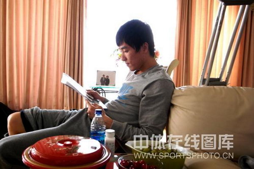 2008年12月7日,恢復(fù)中的劉翔在家看雜志
