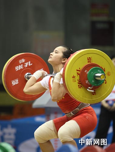 中新網(wǎng)重慶4月24日 (孟幻 李楊陽(yáng))第十一屆全國(guó)運(yùn)動(dòng)會(huì)女子舉重預(yù)賽暨全國(guó)女子舉重錦標(biāo)賽24日在重慶揭幕。在當(dāng)天比賽中,各隊(duì)運(yùn)動(dòng)員隱藏實(shí)力,只求擦邊挺進(jìn)全運(yùn)會(huì)。北京奧運(yùn)冠軍陳?ài)葡紵o(wú)緣錦標(biāo)賽獎(jiǎng)牌,但她誓言?shī)Z取全運(yùn)會(huì)金牌。