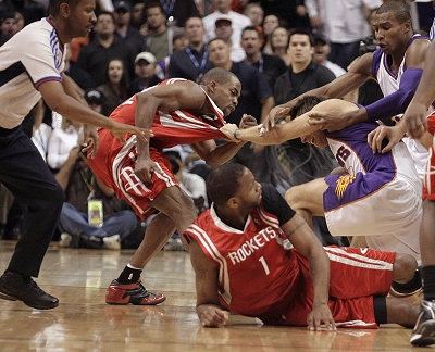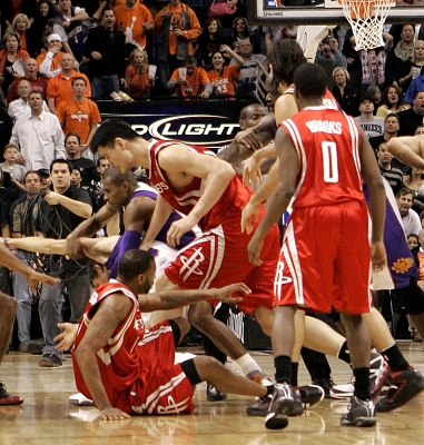 從洛杉磯倉皇逃離,來到鳳凰城的火箭需要一劑神奇的療效藥,幸運的是,他們昨晚得到了,火箭的全體球員都恢復得很好,他們最終以94比82擊敗太陽。有意思的是,最大限度刺激球迷神經(jīng)的不是經(jīng)典的“姚鯊對決”,也不是奧尼爾超越哈夫里切克成為歷史得分王第十,更不是麥迪的27分,而是阿爾斯通引發(fā)的群毆。這場群毆幾乎囊括了在場的全部10名球員,最終導致2人被罰出場、3人吃到技術犯規(guī)。