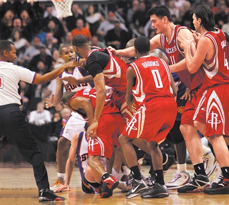 NBA比賽絕對(duì)能給人以強(qiáng)烈的視聽沖擊,每一場(chǎng)比賽你甚至能聽到“肌肉碰撞”的聲音。因此,在這個(gè)大個(gè)子們、壯漢們充塞的賽場(chǎng),可以想見雄性荷爾蒙的濃度——一個(gè)動(dòng)作或者一次口角都會(huì)點(diǎn)燃一場(chǎng)毆斗。比如昨天火箭與太陽的比賽,一個(gè)帶有挑釁性的肘部動(dòng)作就引來雙方大打出手——為了自家兄弟,決不能在氣勢(shì)上輸陣——所以你才看到了好好先生姚明沖將上去。不過,這種場(chǎng)面對(duì)于見慣了NBA大場(chǎng)面的球迷,根本就是小菜一碟!
