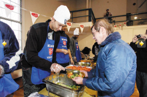 昨天,易建聯(lián)(左圖左一)和卡特、哈里斯等籃網(wǎng)隊員一起來到新澤西的一家教堂,在感恩節(jié)到來之際,向當(dāng)?shù)厣鐓^(qū)貧困居民分發(fā)食品。在活動現(xiàn)場,易建聯(lián)身著便裝頭戴一頂繡有籃網(wǎng)標志的廚師帽發(fā)放食物,整個活動過程中易建聯(lián)始終面帶微笑,并和獲贈食物的居民親切交談。