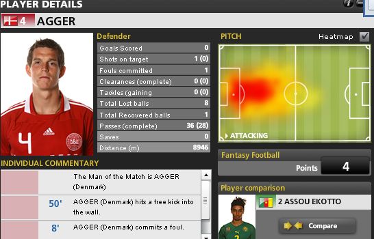 對(duì)于喀麥隆隊(duì)的比賽,盡管對(duì)手在比賽中大部分時(shí)間內(nèi)都在圍繞著丹麥隊(duì)的球門狂轟濫炸,但是阿格協(xié)助門將索倫森力保大門不被輕易攻破。除了埃托奧在開場(chǎng)后10分鐘利用隊(duì)友的失誤而打入一球,其他的比賽時(shí)間里,阿格鎮(zhèn)守的大門固若金湯,即便喀麥隆隊(duì)將丹麥隊(duì)的防線乃至索倫森的十指關(guān)打穿,阿格也仍然是一到不可逾越的防線,將皮球破壞出危險(xiǎn)范圍。