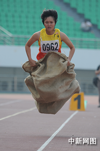 在今天上午進行的第六屆全國農(nóng)民運動會田徑比賽中,60米麻袋跳搬運賽跑成為全場亮點。選手需在麻袋里“蹦”到沙袋前,然后徒手將沙袋搬運到終點。圖為廣西選手在比賽中“一飛沖天”。