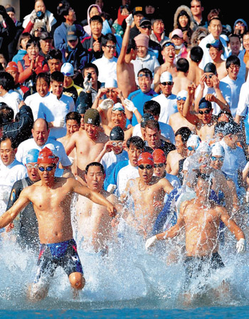 中新網(wǎng)1月13日電 據(jù)韓國《朝鮮日?qǐng)?bào)》報(bào)道,韓國慶尚南道巨濟(jì)市德浦海水浴場(chǎng),日前舉行了“第5屆巨濟(jì)企鵝游泳大比賽”。參加本次大會(huì)的1500多人不顧嚴(yán)寒的天氣,一同涌向冰冷的大海。