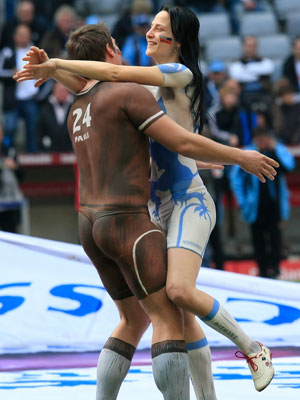 德乙聯(lián)賽第22輪,慕尼黑1860在主場以5:1大勝圣保利。 終場前從主客兩隊的看臺上分別躍下一個身穿1860隊服的姑娘和一個身穿圣保利隊服的小伙,兩人一路狂奔來到球場中圈,旁若無人的熱吻起來。仔細觀察才能發(fā)現(xiàn)他們所穿的“隊服”的奧秘----這對情侶都只穿了一條內褲,他們身上的衣衫完全是足以亂真的人體彩繪,F(xiàn)場保安也為這浪漫一幕所感動,他們面帶微笑將這對情侶請出草坪。(圖片來源:1860隊官方網站)
