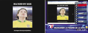 當?shù)貢r間周五,阿根廷TN電視臺報道了一起網(wǎng)絡襲擊事件,一名自稱為“KKR”的黑客襲擊了阿根廷足協(xié)官方網(wǎng)站(.ar),在阿根廷足協(xié)官網(wǎng)上放上了一張馬拉多納身穿巴西國家隊球衣的照片。