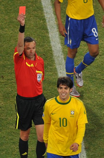 下半場,卡卡表現(xiàn)活躍,并在第63分鐘左路傳中,助攻隊(duì)友埃拉諾得分,巴西隊(duì)也以3比0大比分領(lǐng)先。幾分鐘后,科特迪瓦隊(duì)換人,勞下,K-凱塔上!。這次換人也成為卡卡的噩夢。比賽進(jìn)行到85分鐘,卡卡犯規(guī),吃到本場比賽的第一張黃牌。三分鐘后,卡卡用胳膊肘推倒了K-凱塔。主裁判向卡卡出示了第二張黃牌!卡卡被紅牌罰出場!