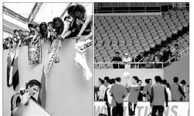 然而,這樣的熱烈氛圍隨著中國隊的到來消散殆盡。當(dāng)?shù)聡犕藞觥⒅袊犨M場時,近2000名球迷竟然像潮水退潮一般,轉(zhuǎn)眼就迅速地隨德國隊一同離場。一名女球迷在撤退時向同伴高喊:“中國隊來了,快跑!”最終堅持留在體育場看中國隊訓(xùn)練的球迷,竟然只有屈指可數(shù)的8個人。(記者鄭小龍)
