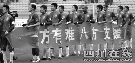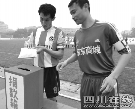 2:1的勝利結(jié)束之后,連續(xù)兩 場(chǎng)進(jìn)球的成足隊(duì)長(zhǎng)李鋼說,“希望災(zāi)區(qū)的人們像我們今天比賽一樣,無論遇到什么樣的困難,只要我們團(tuán)結(jié)一心,只要我們選擇堅(jiān)強(qiáng),我們都能獲得最終勝利!”比賽結(jié)束之后,球迷散去的人群中還有纏著綠絲帶的志愿者球迷在募捐,“球賽盡管結(jié)束了,可是我們還想為災(zāi)區(qū)再多做一點(diǎn)事情,我們做得越多,他們受到的苦難就會(huì)越少!