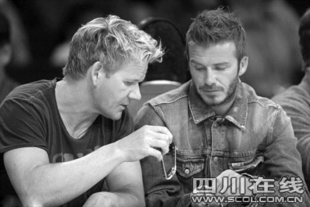 和小貝一起看球的,是英國頂級廚神戈登·拉姆塞,因其在各種名人烹飪節(jié)目中粗魯、嚴苛,以及追求完美的風格,被媒體稱為“地獄廚師”。貝克漢姆與拉姆塞的關(guān)系匪淺,正是小貝幫助拉姆塞進入了洛杉磯的名人圈子,并幫助他打響了在美國的招牌。當天,拉姆塞就坐在小貝包下的價值2200美元的座位上,也許是場上湖人的表現(xiàn)確實不佳,兩人無聊之