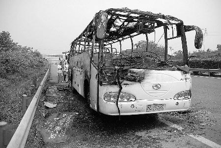 昨日上午11時30分,幾名交警正在現(xiàn)場指揮拖車把這輛燒得面目全非的客車拖走。記者看到,這輛車牌為川A79769的客車已被燒成了黑漆漆的光架子,車內30多把座椅也只剩下鐵架,右側的車頭裂了一條一米多長的縫隙,車尾的后擋板完全被燒毀,露出了車內的零件。地面更是一片狼藉,黑水橫流,空氣中彌漫著一股濃烈的焦臭味。