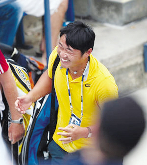 兩盤比賽,李娜沒有給對手任何機會,丈夫姜山在場下的表情逐漸變得豐富起來,不再是往常那樣的面無表情或者是淺淺的微笑,從他的臉上能看出明顯的情緒變化,滿臉的笑容能夠讓所有人感受到他的興奮。第二盤在自己的發(fā)球局里,李娜連得三分拿到三個賽點,并且在第一個賽點出現(xiàn)時就拿下比賽。李娜在賽場內(nèi)蹦了起來,姜山和托馬斯在場外也是一陣狂喜,姜山的眼睛瞇成了一條縫,嘴也快咧到耳根。跟往常一樣,姜山和托馬斯在比賽結(jié)束之后就背著球包離開。他和托馬斯一邊走一邊聊天,不斷有球迷從他們倆中間穿過,這絲毫沒有影響兩人的好心情,他們很興奮地一邊聊天一邊比劃著。姜山伸出食指指向天空,難道是已經(jīng)將目標瞄準了第一嗎?