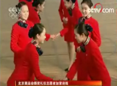 另據(jù)中央電視臺(tái)報(bào)道,練站姿,包括要穿五厘米的高跟鞋,頭上頂課本、膝蓋中間夾白紙,站上一個(gè)小時(shí)要求書和白紙都不能掉下來。她們美麗溫柔的笑容,也都是經(jīng)過標(biāo)準(zhǔn)化訓(xùn)練的!靶σ读桨祟w牙,一定要是發(fā)自內(nèi)心的微笑,”一位頒獎(jiǎng)禮儀志愿者面對(duì)鏡頭如是說。