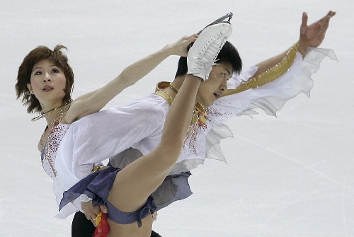 美國組合井上憐奈/巴爾德溫(Rena INOUE / John BALDWIN)是一對老將,今年女伴已經(jīng)31歲、男單已經(jīng)34歲;2007-08賽季的大獎賽美國站中,這對組合獲得了冠軍,十分不易。今天的比賽中發(fā)揮出了自己的水平,動作順利完成,技術(shù)分得到了31.86分、節(jié)目內(nèi)容得到了25.54分,短節(jié)目總分57.40分,暫列第三位。