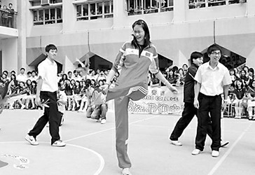 趙蕊蕊與學(xué)生們比賽踢毽子。