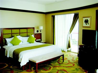 陽(yáng)光大酒店是由中石油投資興建的準(zhǔn)五星級(jí)酒店,今年9月才剛剛開業(yè),酒店分園景房和海景房?jī)纱箢惞?種房型,楊威和楊云結(jié)婚當(dāng)晚的洞房是價(jià)錢最貴的超級(jí)豪華海景套房,位于第11層,昨日仍在布置當(dāng)中,當(dāng)然無法參觀。但記者在酒店銷售經(jīng)理孫小姐的帶領(lǐng)下,參觀了與其結(jié)構(gòu)完全相同的另一套客房。