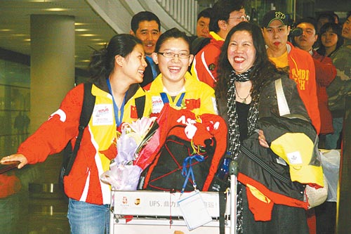 中國(guó)女子冰壺隊(duì)昨天在韓國(guó)奪得世錦賽冠軍的消息在國(guó)內(nèi)引起了轟動(dòng)。今天下午,當(dāng)她們從韓國(guó)飛抵北京首都機(jī)場(chǎng)后,數(shù)十名守候的記者把她們團(tuán)團(tuán)圍住,一向很少有人關(guān)注的中國(guó)冰壺姑娘面對(duì)大堆相機(jī)和話筒,感到受寵若驚,在賽場(chǎng)上以沉著冷靜著稱的隊(duì)長(zhǎng)王冰玉,在這一刻也激動(dòng)得說不出話來。