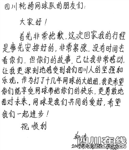 “四川輪椅網(wǎng)球隊(duì)的朋友們,大家好……”在輪椅網(wǎng)球隊(duì)隊(duì)員的簇?fù)硐拢叹氷惲忠粋(gè)字一個(gè)字地讀著鄭潔的回信,偌大的網(wǎng)球場(chǎng)一下就安靜下來。上個(gè)月來到災(zāi)區(qū)獻(xiàn)愛心的鄭潔,通過本報(bào)記者了解到了四川輪椅網(wǎng)球隊(duì)的情況后,這位重情義的川妹子立刻承諾要寫信鼓勵(lì)隊(duì)員。在奔赴德國(guó)比賽前,鄭潔將親筆信和20多張簽名照片快遞給了本報(bào)記者,并委托記者一定要親手交到隊(duì)員們的手中。