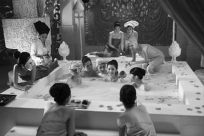 片中,有一場蔡卓妍和眾多宮女在大型浴缸洗澡的場景戲。唯美的場景,加上眾多的美女,令整個畫面看起來相當(dāng)養(yǎng)眼。記者從片方處得知,為了打造這段場景戲,投資方不惜花費重金,耗資金百萬打造豪華皇宮,周邊的布景和擺設(shè)也是全部按照皇室宮廷級別設(shè)計。置身于這樣的場景拍洗澡戲,蔡卓妍也表示,“真的享受了皇后的待遇”。