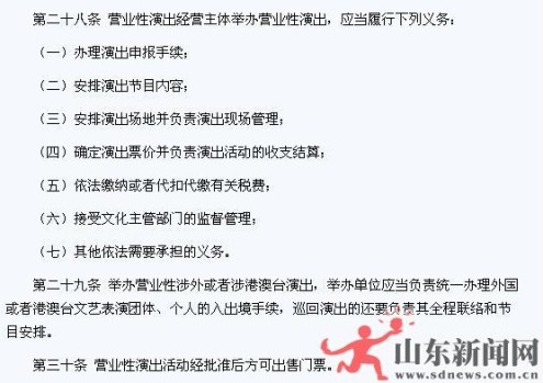 根據(jù)我國09年出臺(tái)的最新《營業(yè)性演出管理?xiàng)l例實(shí)施細(xì)則》第二十八條規(guī)定,營業(yè)性演出經(jīng)營主體舉辦營業(yè)性演出,應(yīng)當(dāng)履行辦理演出申報(bào)手續(xù)、安排演出節(jié)目?jī)?nèi)容、接受文化主管部門的監(jiān)督管理等義務(wù)。緊接著,第三十條規(guī)定,營業(yè)性演出活動(dòng)經(jīng)批準(zhǔn)后方可出售門票。在《細(xì)則》中還明確指出,跨省區(qū)演出的,應(yīng)當(dāng)出具其他演出所在地省級(jí)文化主管部門的審核意見。