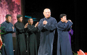 郭德綱、于謙合作10周年專場演出14日如約開場,現(xiàn)場座無虛席。此番亮相的郭德綱顯得頗為低調(diào),他在對話中表示,自己只是一個說相聲的,“能力有限,水平一般”。此次演出郭德綱個人為舟曲災(zāi)區(qū)捐出了10萬元,德云社和演出承辦方也各捐出5萬元,對于因為哀悼日而暫停的15日的演出,郭德綱表示:“所有15日票的觀眾都可以去退票,也可以留著,等我們開演的時候繼續(xù)使用,F(xiàn)在不是我們不訂演出時間,實在是北展后面的演出太多了,一切需要重新協(xié)調(diào)!