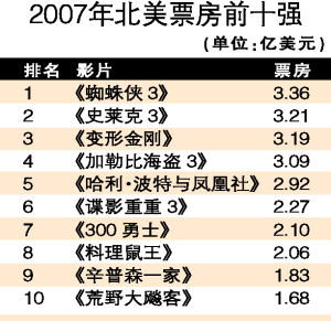 尚有數(shù)天便告別2007年,是時(shí)候?yàn)楹萌R塢電影發(fā)一張票房成績表。今年,《蜘蛛俠3》以3.36億美元(約合25億人民幣)成為北美最賣座電影。綜觀今年電影票房,仍然是特技片與動(dòng)畫片的天下,由香港動(dòng)畫師許誠毅執(zhí)導(dǎo)《史萊克3》領(lǐng)跑動(dòng)畫片,以3.21億美元排名第二。