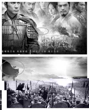 有網(wǎng)友特意圈出兩張海報幾處細(xì)節(jié)來證明《赤壁》的“抄襲”嫌疑。記者看到,《300勇士》的海報上,近景是一群拿著矛和盾的士兵正在行進(jìn),畫面的左面還有一個突出的山峰,上面有一棵樹,突出的山峰和那棵樹也在《赤壁》的海報上赫然在目。另外一處是兩位士兵手持長矛交叉在一起,兩張海報上士兵長矛交叉的角度完全一樣,還有就是在士兵中出現(xiàn)的一位騎著馬的將領(lǐng)也如出一轍。