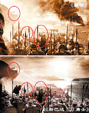 一張《赤壁》和《300勇士》的對比照昨日成為網(wǎng)友熱議的焦點。照片發(fā)布者圈出吳宇森新片《赤壁》官方海報中和《斯巴達(dá)300勇士》劇照的相似之處,并直指《赤壁》抄襲。對此中影營銷分公司負(fù)責(zé)人直斥“無聊炒作”,并稱“每款海報都有不同的風(fēng)格!