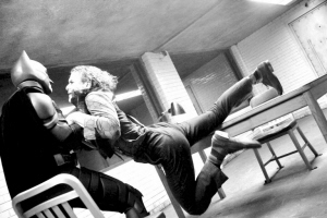 還是在審問期間,“蝙蝠俠”和“小丑”互相糾纏在一起,前者的雙手掐住了后者的頭頸。當(dāng)時采取了不同機位拍攝特寫,從一個角度來看,“小丑”從“蝙蝠俠”的手臂下方抓住他,但從另一個角度來看,“小丑”的手臂卻占據(jù)了上風(fēng),搭在“蝙蝠俠”手臂之上。