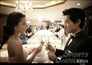 新郎樸周永畢業(yè)于漢陽大學法律系,是韓國中堅建設企業(yè)樂山集團總裁樸成寬的次子,現(xiàn)在首爾江南狎鷗亭洞經(jīng)營美容公司。去年,金喜善經(jīng)熟人介紹在一次聚會上和樸周永相識后,兩人經(jīng)過一年多的甜蜜戀愛,終于修成正果。