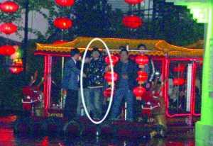 晚上10點多,周杰倫出現(xiàn)在白鷺洲公園。他乘坐的商務(wù)車前有警車開道、后有兩輛車跟隨,四輛車一路呼嘯開到碼頭前。杰倫一下車,四下頓時騷亂起來,很多人撲上前要把周杰倫拍下來。幾名警察把杰倫圍得嚴嚴實實,送上了船,這才安靜下來。隨后,一船開道,杰倫乘坐的“聚寶號”緊隨,后有兩條船“斷后”。周杰倫的秦淮河之旅終于正式開始。