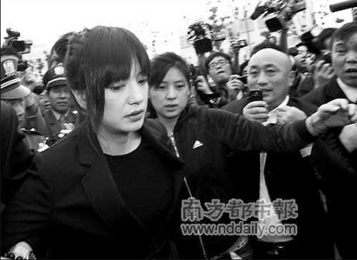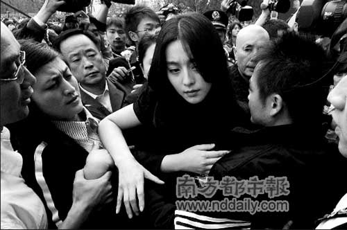 來為恩師送行的范冰冰、趙薇就沒有那么幸運(yùn)。據(jù)說,兩人原本打算從正門進(jìn)入,卻接到提前到達(dá)的電影局副局長江平的電話,安排兩人改從地下停車場或者側(cè)門進(jìn)入。等范冰冰到了側(cè)門,發(fā)現(xiàn)人比正門還多,只好又繞到正門進(jìn)入。有記者撰文稱:“范冰冰先是被人群沖散,不得已而走了正門,沖過重重人群進(jìn)入大廳,她的臉被擠得幾乎變形,表情也極度痛苦。經(jīng)紀(jì)人和司機(jī)為了保護(hù)她,差點(diǎn)和圍觀的拍照者打了起來,范冰冰見狀忙大叫,‘不要打了!’”