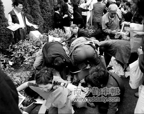 更有甚者,還有小偷來到混亂的現(xiàn)場企圖混水摸魚,F(xiàn)場記者說,本來打算去拍社會新聞的一家報社攝影記者,剛到現(xiàn)場就變成了社會新聞的主角!八チ艘粋人,說是偷相機(jī)的,二人扭打著從外面進(jìn)來,后續(xù)沒看到,反正警察也處理了……而這件事情教育所有的記者,把包拉到自己看得見的范圍……”