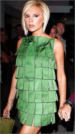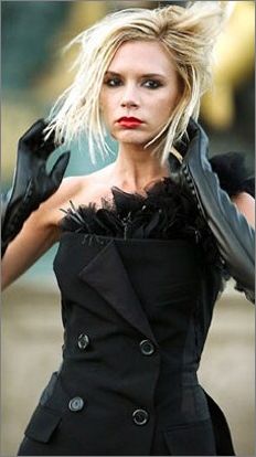 點(diǎn)評(píng):還記得《101只斑點(diǎn)狗》里的皮革愛(ài)好狂克魯拉嗎?貝嫂的黑色斜肩小禮服雖然酷味十足,看看一頭凌亂的金發(fā)和烈焰紅唇,頗有克魯拉刻薄的姿態(tài)。