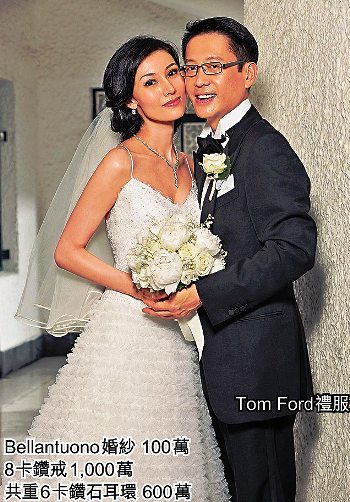 據(jù)報道,新娘子李嘉欣在婚禮上穿了兩套婚紗,一套是由李嘉明同學(xué)、香港著名設(shè)計師張潔雯(Bonita Cheung)設(shè)計的米白色低胸婚紗,上身繡銀線及立體喱士,裙襬則是八層真絲網(wǎng)紗,配以頭紗及18呎長拖尾,超過30萬元,由設(shè)計師當(dāng)禮物送予嘉欣。另一套婚紗,則是于名人婚紗店The Wedding Shop訂做的意大利婚紗Bellantuono,由40個師傅、用200小時專人縫制,約值100萬元。亨亨的禮服則是Tom Ford出品。