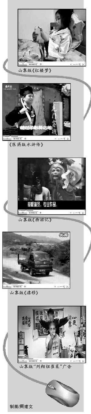 這只是近期眾多走紅網(wǎng)絡(luò)的網(wǎng)友自制影視劇中的一部。在電腦中輸入“山寨”一詞就會(huì)發(fā)現(xiàn),電視劇《水滸傳》、《西游記》,電影《大話西游》、《尋槍》、《頭文字D》,“優(yōu)樂美奶茶”、“劉翔紐崔萊”以及部分電視購物廣告,均被推出了山寨版。