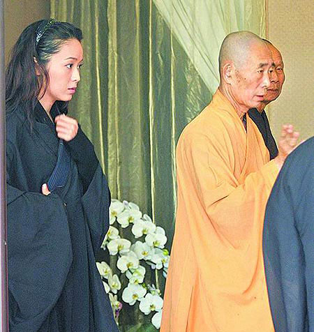 侯佩岑(左)參加父親頭七法會。