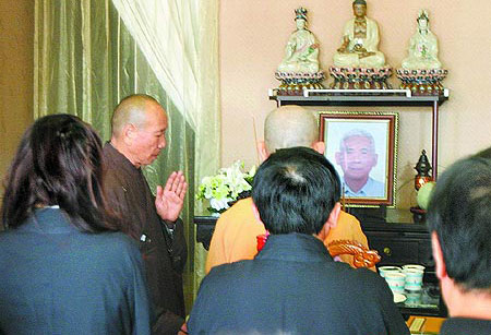 侯佩岑(左)跟著家人在靈堂前誦經(jīng)。