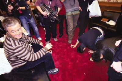 1月28日,北京,央視春節(jié)聯(lián)歡晚會在1月25日除夕夜舉行。零點鐘聲敲響后,與師傅成功搭檔表演小品《不差錢》的小沈陽和眾徒弟按照東北習(xí)慣,跪地給師傅趙本山磕頭拜年。