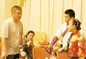 很少能看到趙本山和小沈陽同臺表演,這次海南之行的首場演出,恐怕也是“劉老根大舞臺笑轉(zhuǎn)2009”全國巡演中唯一一場本山師徒同臺的表演,因?yàn)橛^眾是參加博鰲論壇的國際政要和經(jīng)濟(jì)專家。在演出后臺,本山首先演練了一遍即將在舞臺上表演的“吹拉彈唱”,隨后就開始對自己的徒弟一一評點(diǎn)。別看徒弟們個(gè)個(gè)在舞臺上精神抖擻,但在面對如此大場面時(shí)不免有些緊張,紛紛對師父說出自己的顧慮!皠e緊張,就當(dāng)是在咱們沈陽中街基地演了!”“你這個(gè)口我看可以使,沒關(guān)系,出了事我兜著!薄澳阒虚g的那一段就不要加了,不好,不文雅!泵鎸ν降,本山嚴(yán)肅認(rèn)真地對他們的表演提出要求。因?yàn)閷ν降艿谋硌莺徒^活爛熟于心,本山三言兩語就指出了他們的不足,并且提出了建議。有了他的點(diǎn)撥,徒弟們個(gè)個(gè)信心十足地走上了舞臺……