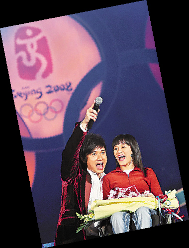 古巨基獲央視與奧委會(huì)邀請(qǐng),出席在北京舉行的新年倒數(shù)晚會(huì),基仔與桑蘭合唱《好想好想》,由于桑蘭需坐輪椅,為遷就她及拉近距離,基仔跪地合唱,場(chǎng)面溫馨。對(duì)于桑蘭的印象,基仔回答:“我覺(jué)得桑蘭非常勇敢和樂(lè)天!绷硗,基仔在活動(dòng)上與劉翔碰面聚舊,并說(shuō):“我最想看到劉翔在跨欄項(xiàng)目中再奪金牌,并希望到時(shí)油機(jī)會(huì)去現(xiàn)場(chǎng)加油。”