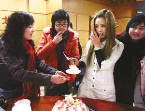 一位從事幼教工作的“盒飯”說很喜歡熱舞《BOYS》,閑暇還教小朋友們跳,何潔立刻調皮地說:“不會帶壞小孩子吧!睘槲繂柵枷瘢劢z們還專門定制了印有何潔頭像的奶油蛋糕,可惜何潔怕破壞瘦身計劃,不敢品嘗。但為安慰粉絲,她還是親自切開蛋糕,分給大家大快朵頤。