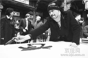 昨天,墨海飄香——群星迎春筆會在坦博藝苑舉辦,多位影視明星、書畫界元老共同參與,揮筆潑墨,其中包括著名歌唱家胡松華、李雙江、戴玉強等。值得一提的是,很少參加內(nèi)地書畫活動的香港藝人也來到現(xiàn)場,香港影視明星徐錦江揮毫潑墨,給媒體留下深刻印象。原來,這位演過“魯智深”、“鰲拜”的港星,并不是一位粗人,徐錦江畢業(yè)于廣州美術學院,是中國南派著名畫家關山月的弟子。在香港演藝圈,外表豪放的徐錦江書畫藝術水平,無人能出其右。